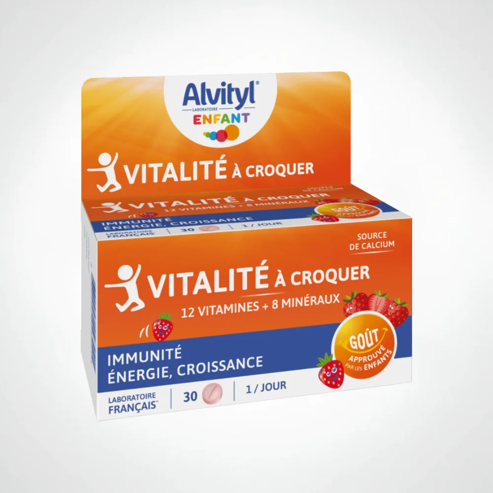 Alvityl Vitalité à Croquer apporte 12 vitamines et 8 minéraux pour soutenir énergie, croissance et défenses naturelles, disponible en Tunisie au meilleur prix.