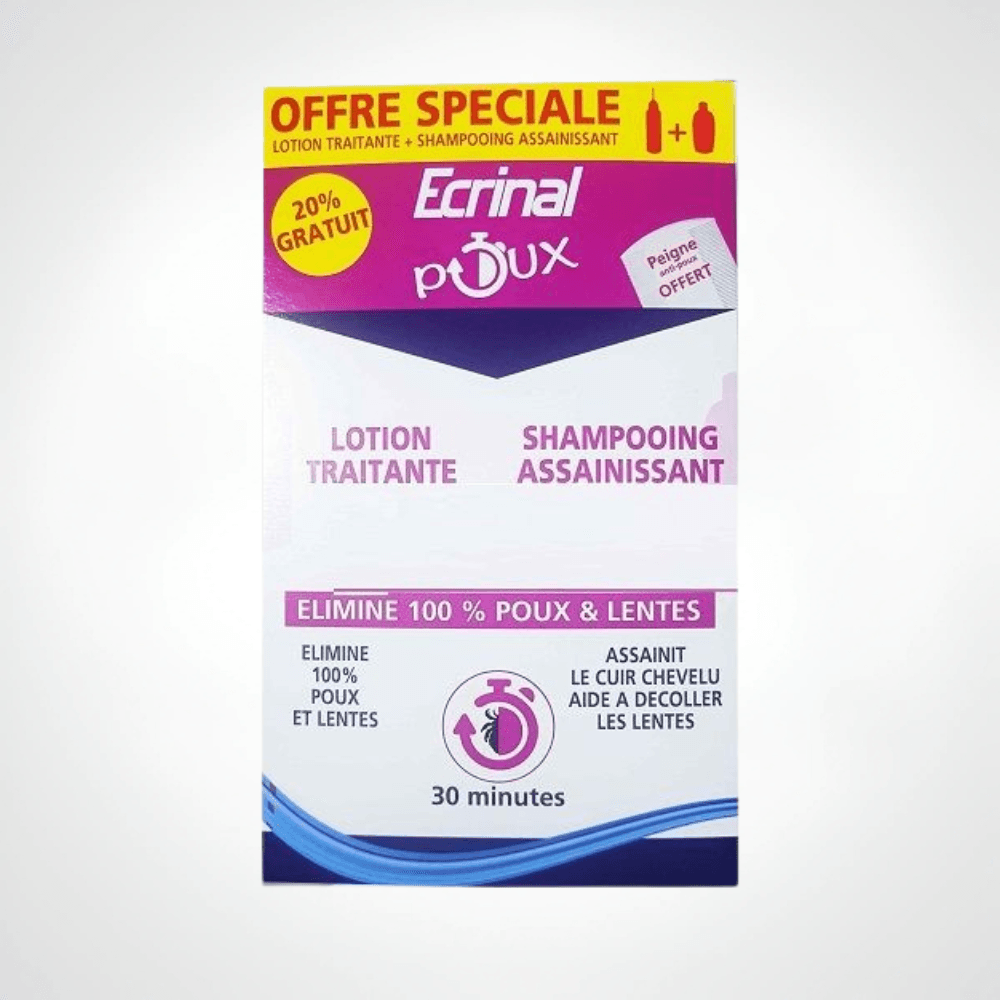 Ne laissez aucune chance aux poux avec la solution complète et experte ECRINAL POUX PACK LOTION TRAITANTE+SHAMPOOING ASSAINISSANT. Grâce à la synergie de la Lotion 100% Poux et Lentes et du Shampooing Assainissant, vous assurez une éradication radicale et une protection durable pour la chevelure de votre famille. Vous investissez dans la tranquillité d’esprit et l’efficacité maximale. Vous trouverez ce kit indispensable à un excellent PRIX et bénéficierez de notre service de livraison rapide en Tunisie. Passez commande pour un traitement complet en toute sécurité !