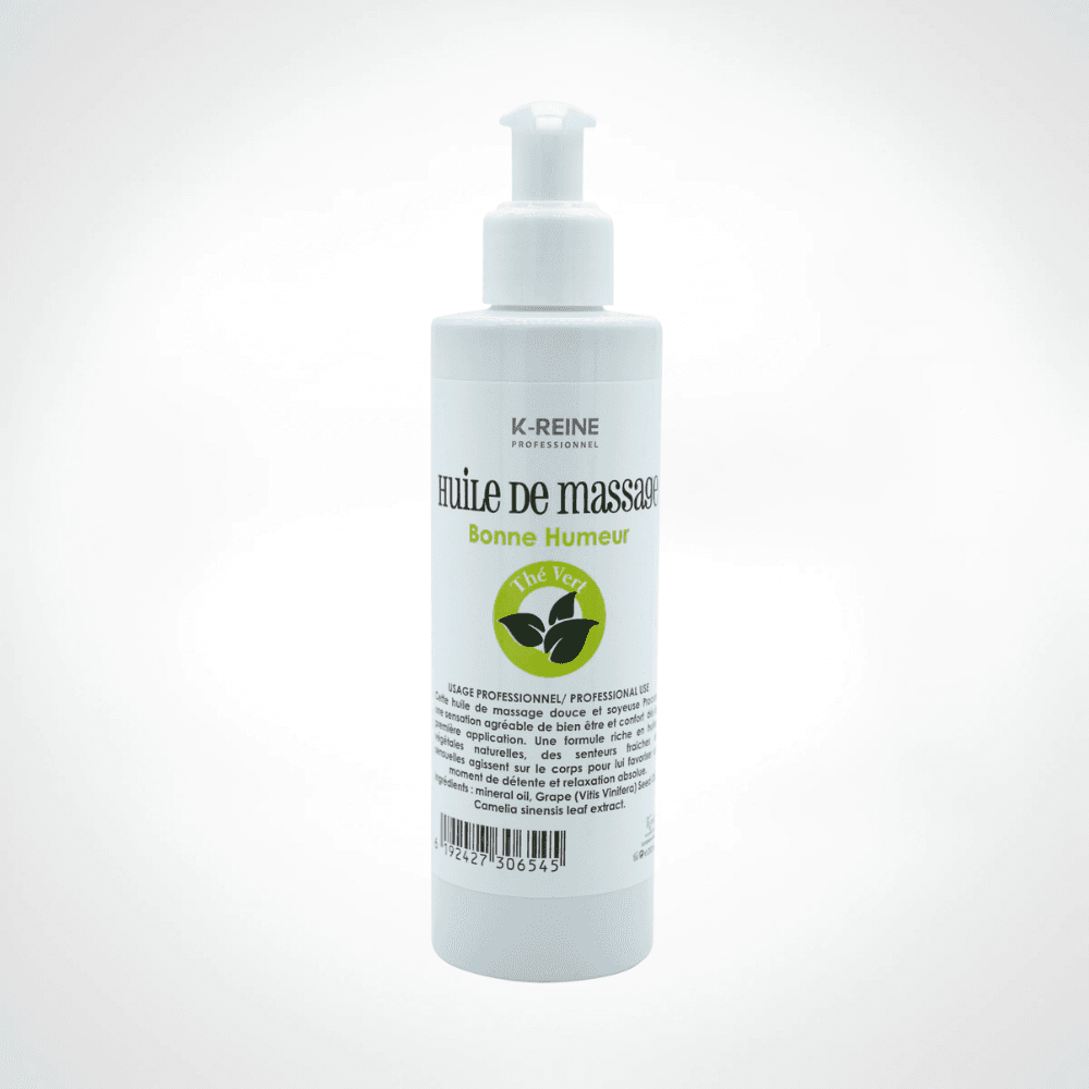 Transformez chaque massage en un moment de pure sérénité avec l’Huile K-REINE au Thé Vert. Sa texture soyeuse garantit une glisse idéale, apaisant les tensions et nourrissant intensément votre peau. Infusée d’extraits de thé vert aux vertus antioxydantes, elle laisse un parfum frais et délicat, pour une sensation de bien-être durable. Peau douce, esprit léger. Flacon 200ml.