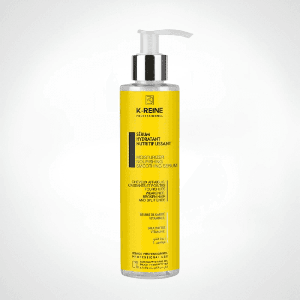K-REINE Sérum Nutritif Lissant 200 ml : Révélez une chevelure d’exception. Sa formule enrichie nourrit intensément, dompte les frisottis et lisse la fibre capillaire pour une brillance miroir et un toucher soyeux. Léger et non gras, il facilite le coiffage, laissant vos cheveux doux, éclatants et visiblement plus sains.