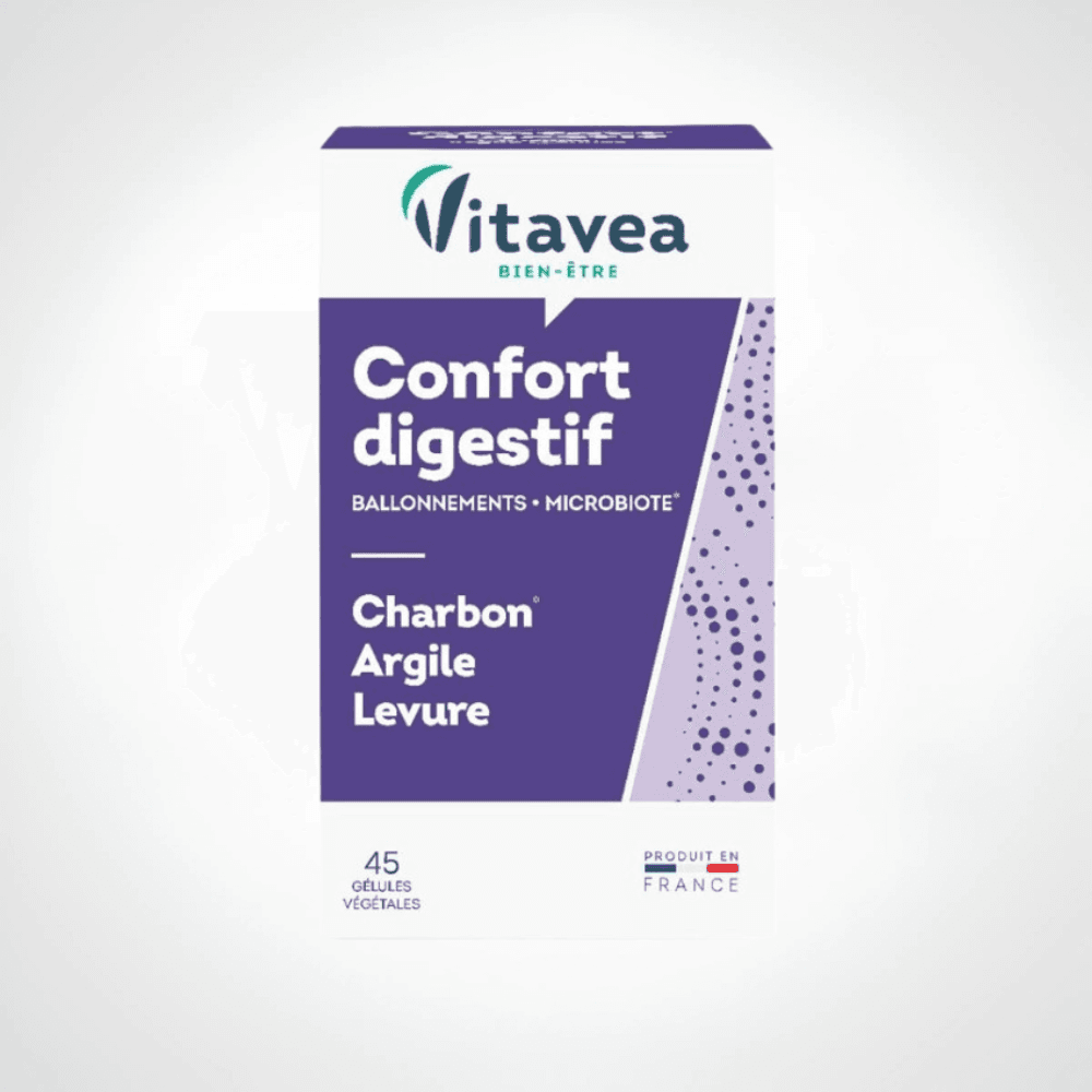 Le VITAVEA CONFORT DIGESTIF CHARBON LEVURE ARGILE  est un complément alimentaire conçu pour rétablir l’équilibre intestinal et améliorer le bien-être digestif. Sa formule associe trois actifs naturels aux propriétés complémentaires : le charbon végétal, la levure et l’argile. Ensemble, ils réduisent les ballonnements, limitent les gaz et favorisent un confort digestif optimal.