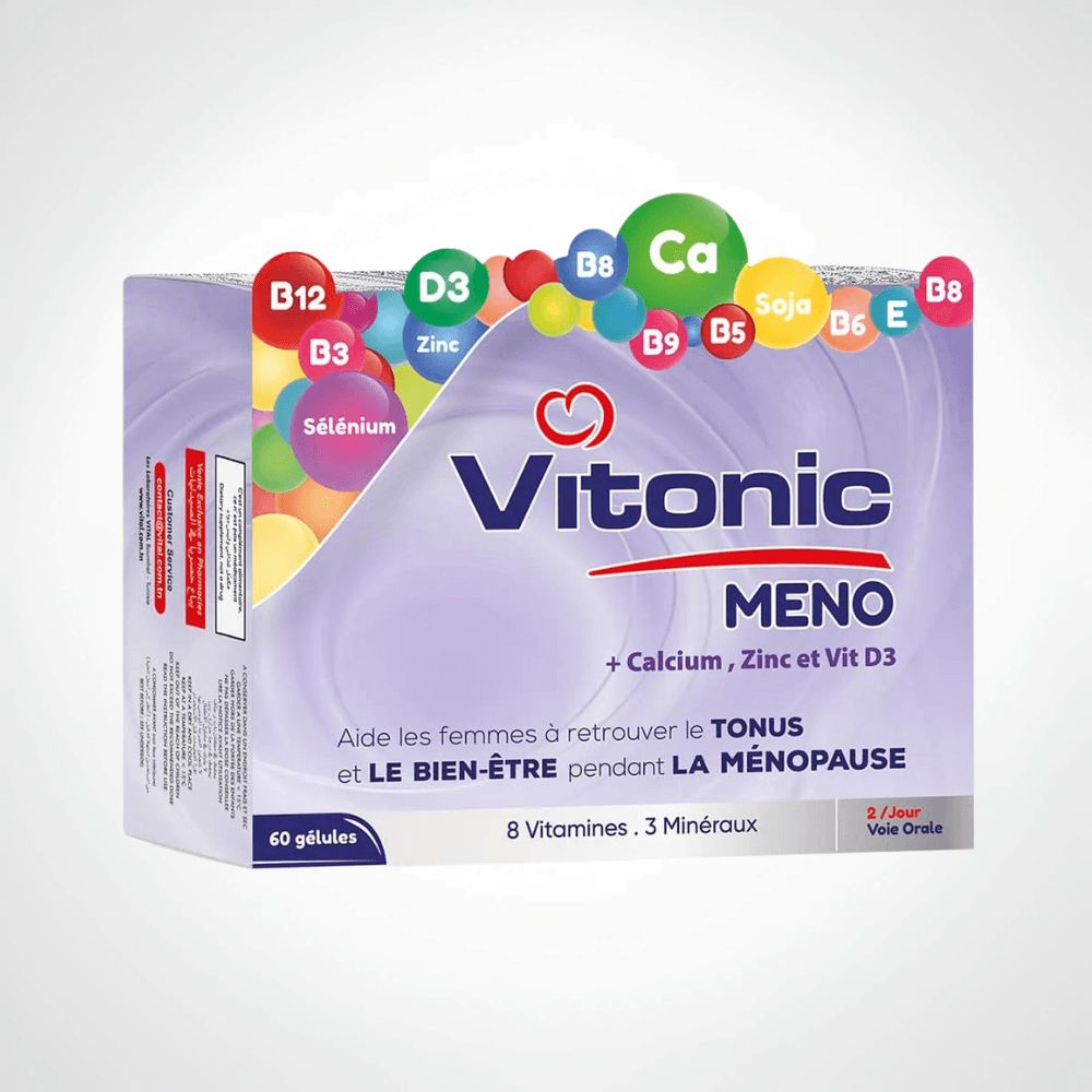 VITONIC MENO 60 GELLULES est le complément idéal pour vivre plus sereinement la période de la ménopause et préserver confort et vitalité.